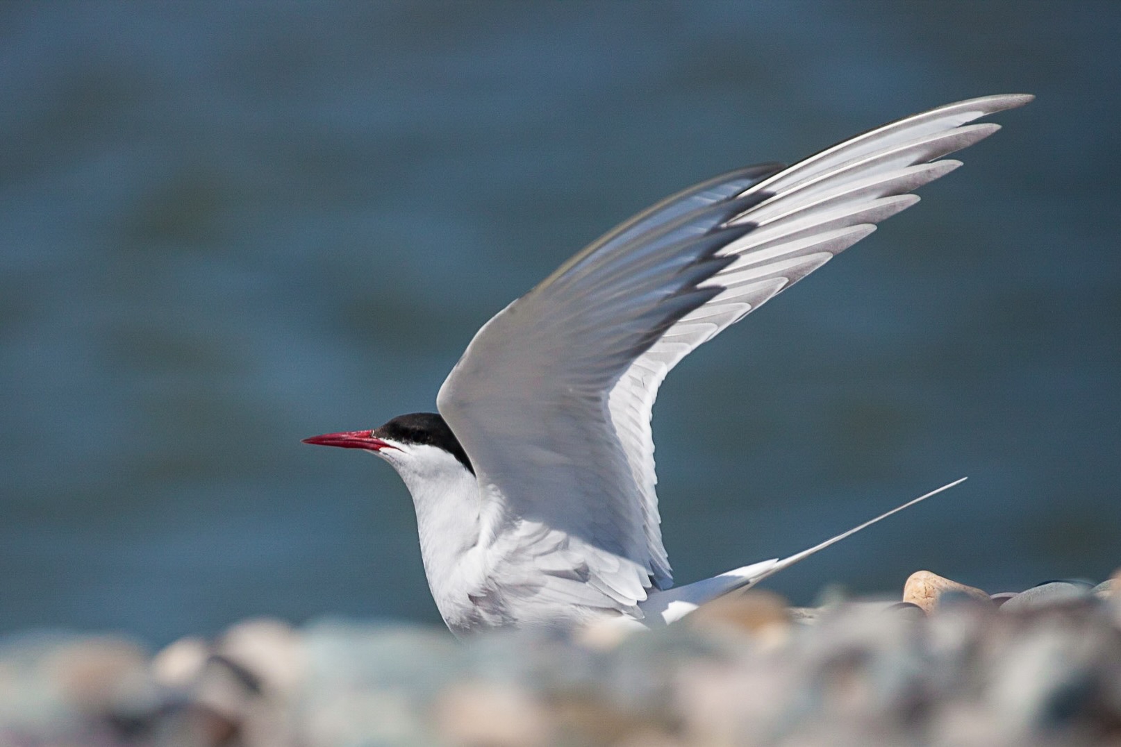 The birds rise in unison with the sandwich terns and the black-headed gulls
